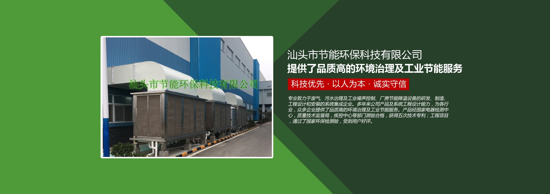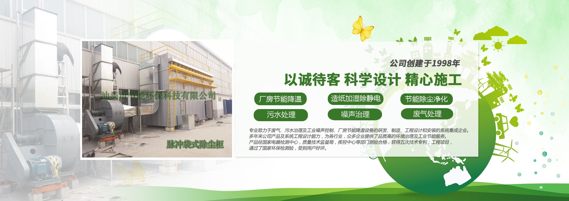 汕頭市節(jié)能環(huán)??萍加邢薰緞?chuàng)建于1998年,是一家專業(yè)致力于廢氣、污水、粉塵、噪聲治理,廠房節(jié)能降溫設備的研發(fā)、制造、工程設計和安裝的系統(tǒng)集成企業(yè)。多年來公司產(chǎn)品及系統(tǒng)工程設計能力,為各行業(yè),眾多企業(yè)提供了品質高的環(huán)境治理及工業(yè)節(jié)能服務。產(chǎn)品經(jīng)國家電器檢測中心,質量技術監(jiān)督局,疾控中心等部門測驗合格,獲得五次技術專利;工程項目通過了國家環(huán)保檢驗檢測,受到用戶好評。